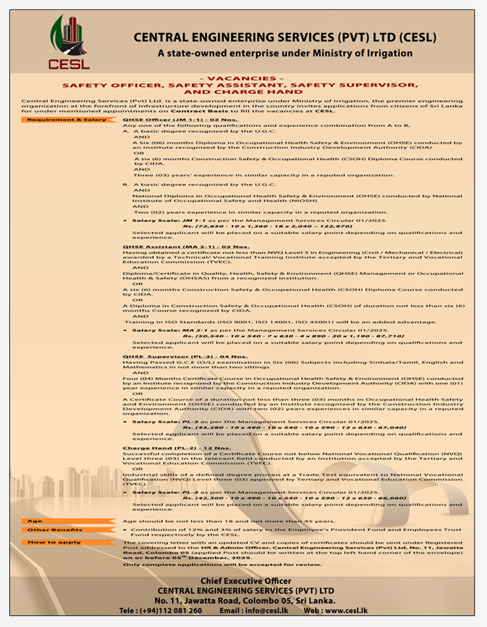 Safety Officer, Safety Assistant, Safety Supervisor and Charge Hand